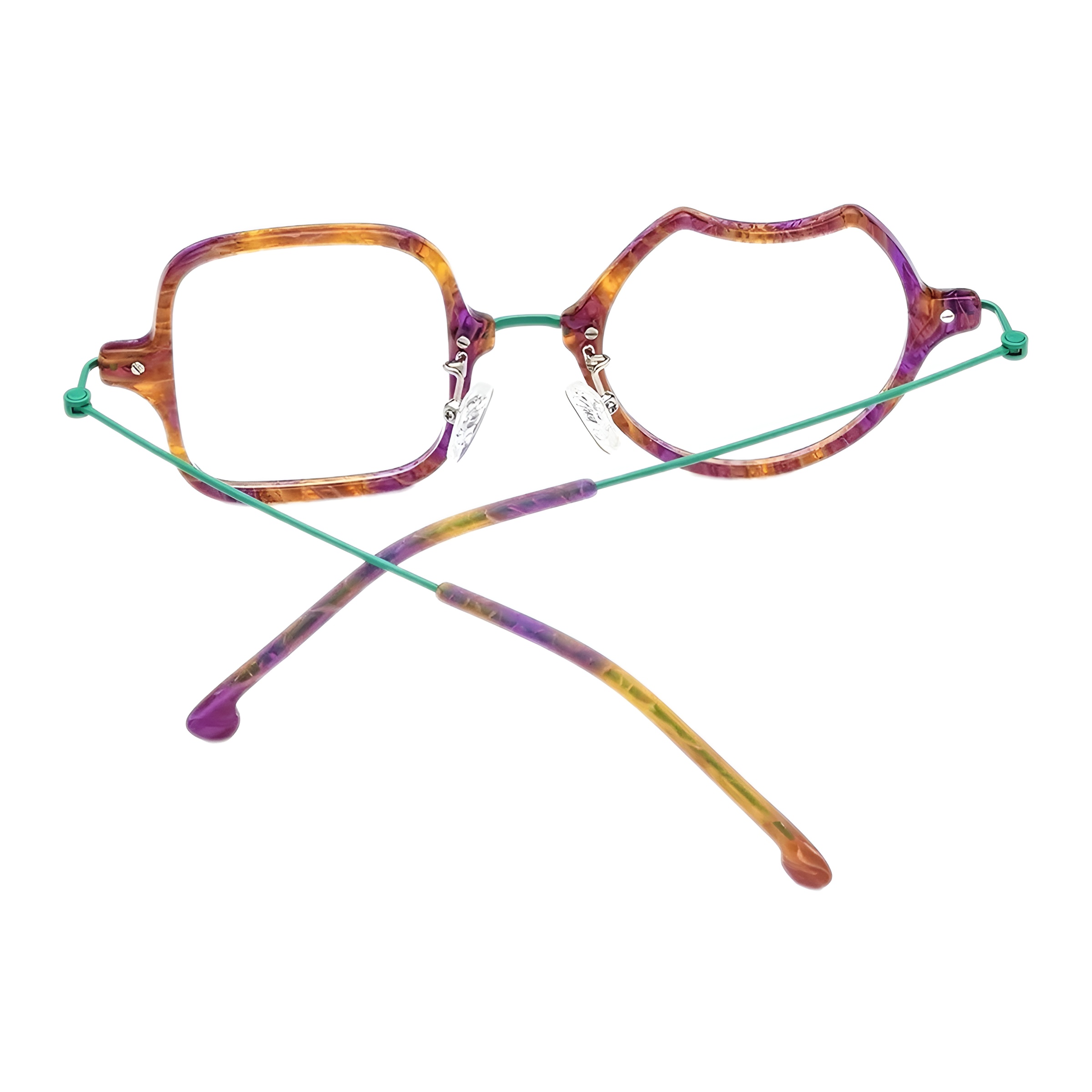 Laissez-vous séduire par la richesse d’un acétate poli aux motifs d’écaille violette et orange. Chaque nuance danse avec la lumière pour un effet visuel saisissant. Les branches et le pont en titane vert émeraude ajoutent une note de couleur vibrante et assurent une légèreté surprenante à cette pièce d’exception.