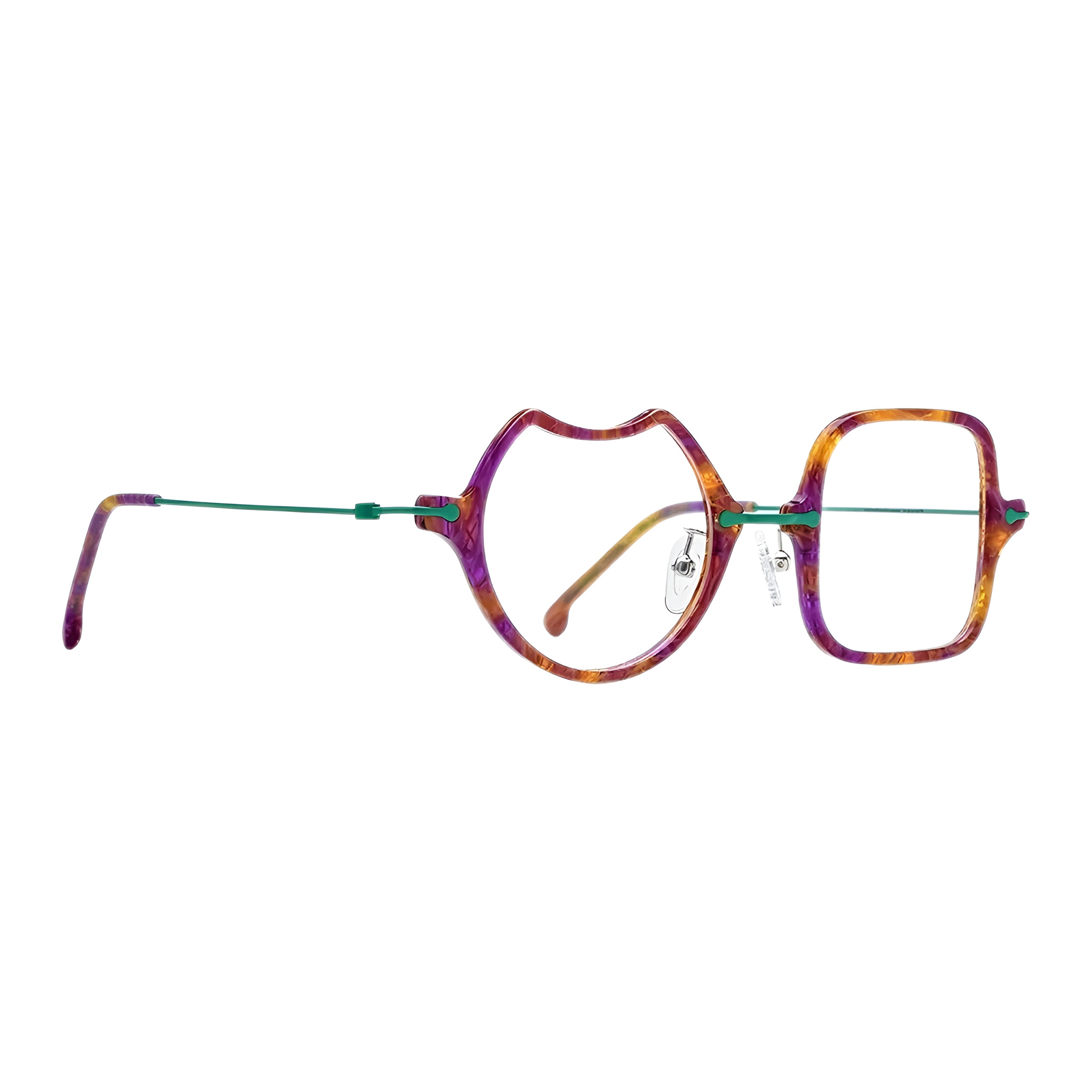 Une conception où le jeu des formes est roi. D’un côté, un design subtilement courbé, de l’autre, la rigueur d’un carré affirmé. Cette monture est une véritable œuvre d’art à porter, une déclaration de style non-conformiste qui brise les codes avec élégance et créativité.