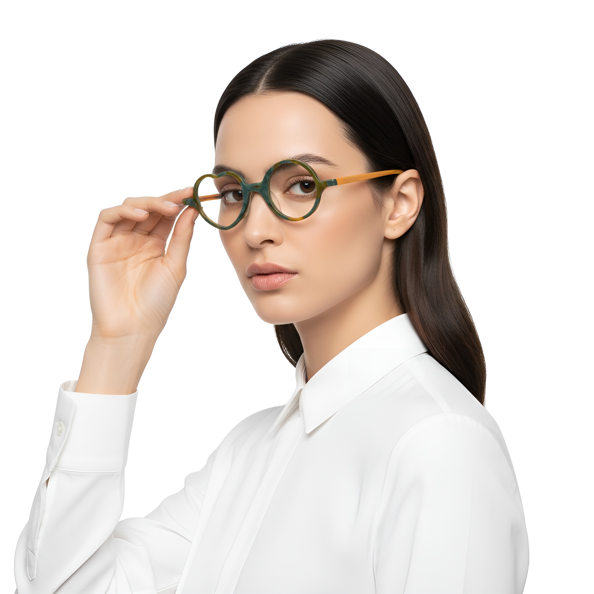 La monture en acétate légère épouse les contours du visage avec souplesse. Les couleurs vert olive et orange se fondent dans des nuances lumineuses, tandis que la structure assure un port confortable au quotidien. Ces lunettes rondes marient esthétique et praticité avec une aisance naturelle.