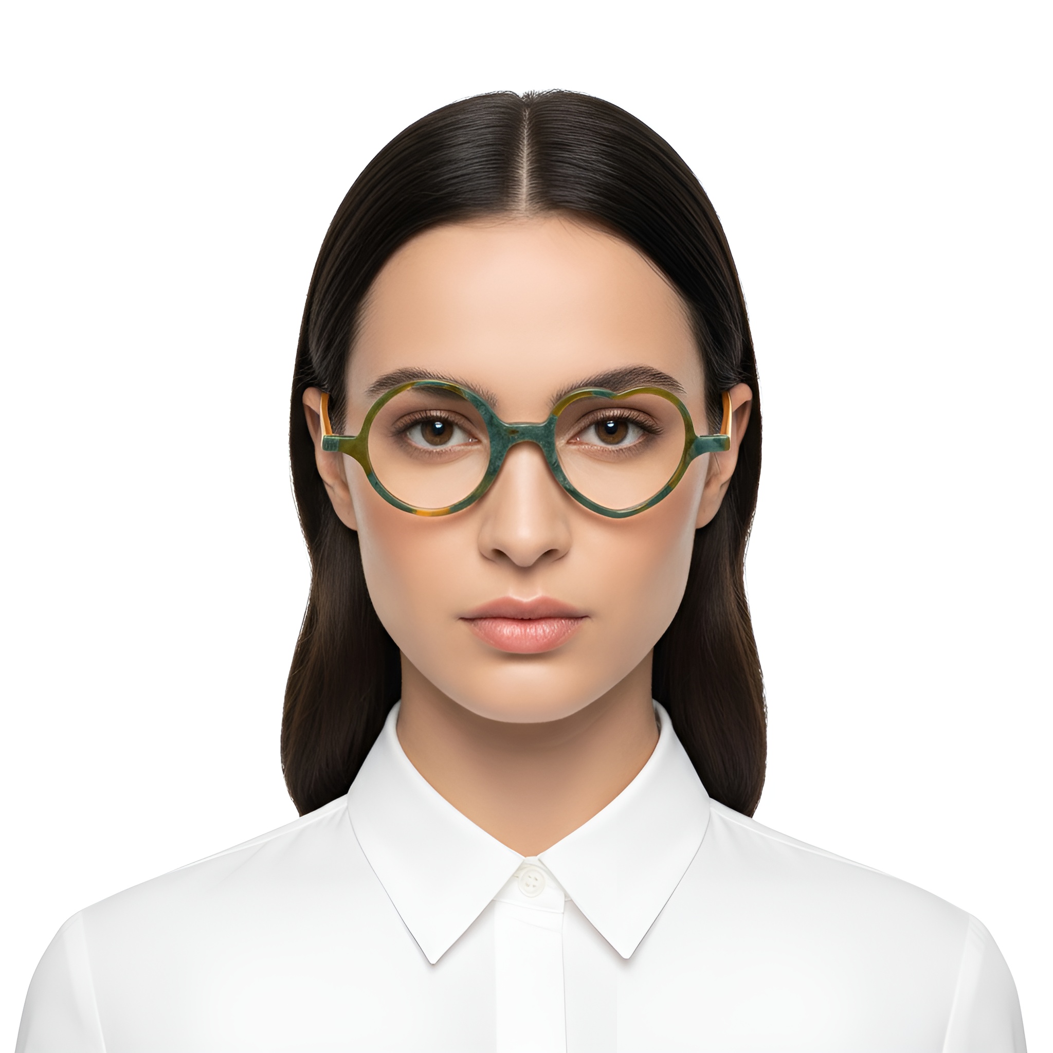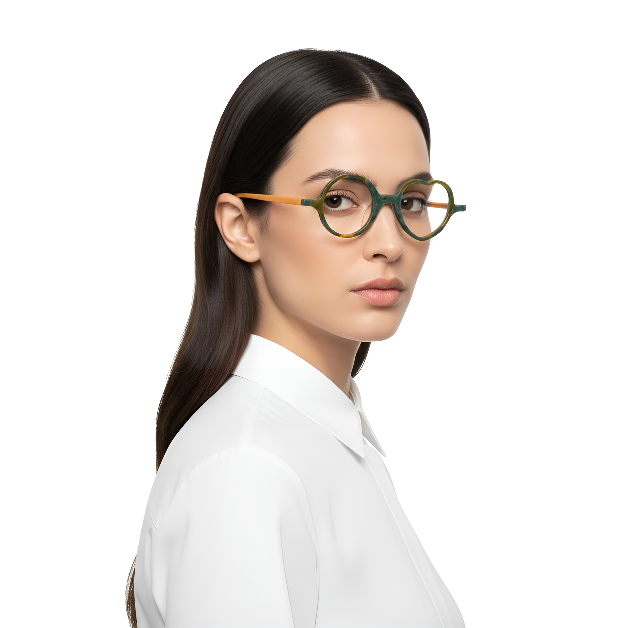 es verres en forme de cœur insufflent une note inattendue aux lunettes rondes. Ce détail délicat casse la rigidité des formes classiques, tout en s’harmonisant avec les tons vert olive et orange. Une monture qui reflète l’expression d’une personnalité subtile mais singulière.